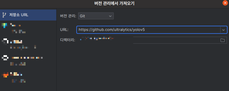 URL : https://github.com/ultralytics/yolov5 을 입력해 git clone을 진행한다. 디렉토리는 사용자가 편한곳으로 설정한다.