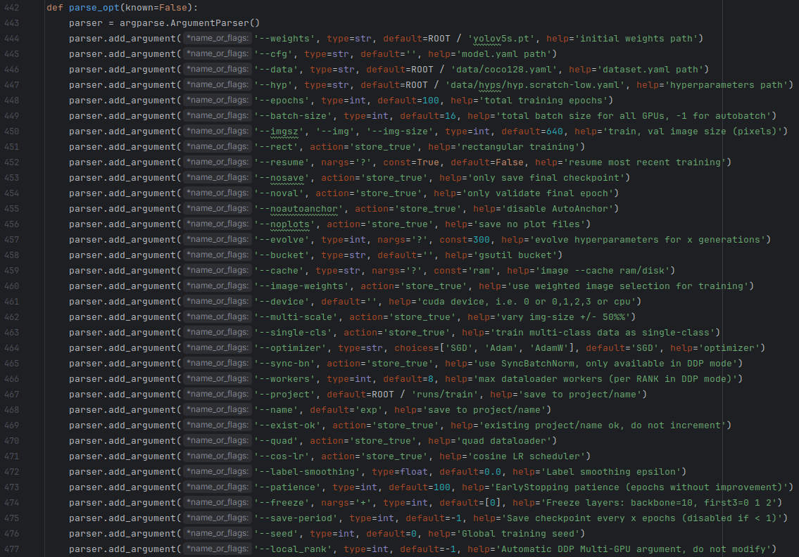 우선 train.py에 들어가면 훈련관련 인자들을 확인 할수 있다. 중요한 인자들만 살펴 보도록 하겠다.