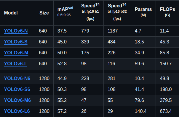 YOLOv6에도 모델의 종류가 많다. YOLOv6는 n, s, m, l 4가지 버전이 존재한다. n는 가장 성능이 낮지만 FPS가 가장 높고, l은 성능이 가장 높지만 FPS가 가장 낮은 특징을 가진다.