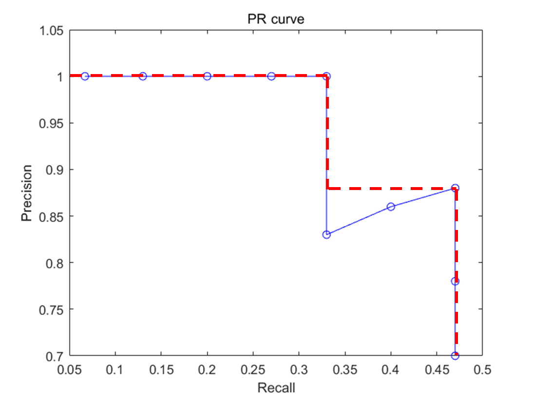 Precision-Recall Curve는 알고리즘의 성능을 전반적으로 파악하기에는 좋지만 다른 알고리즘과 정량적으로 비교하기에는 불편함이 있다. 따라서 나온 개념이 Average Precision(AP)이다. 이를 확인하기 위해 아래의 그래프에 Interpolation(보간법)을 이용해 그래프를 수정해준뒤(빨간색선) 그래프 선 아래의 면적을 계산한 값이 AP이다.