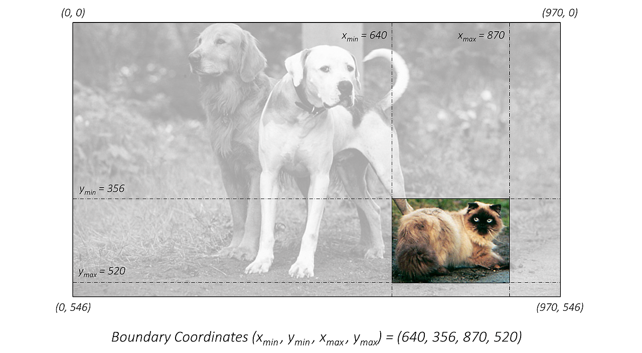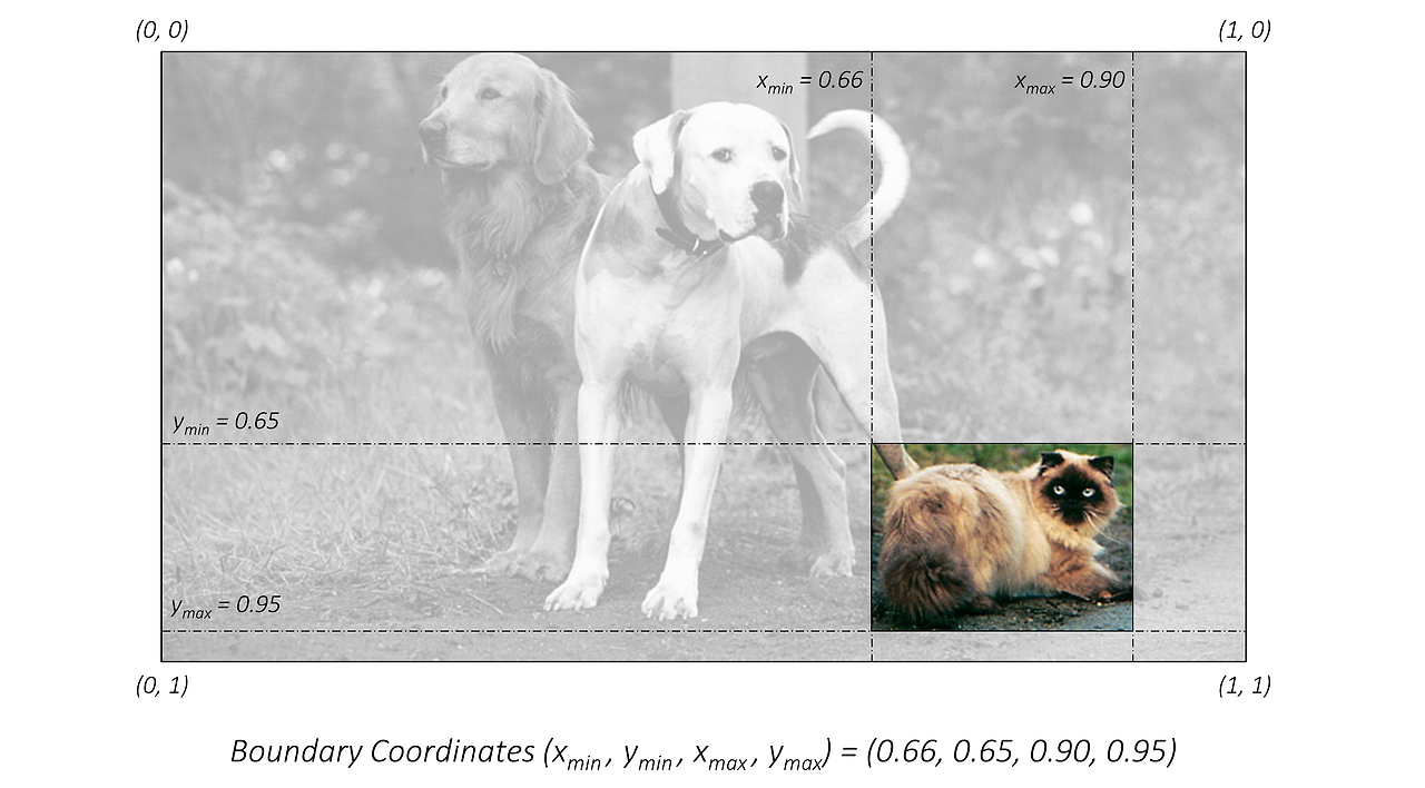 아래의 두그림을 보면 객체의 위치를 특정하기 위해 사각형 형태로 객체의 위치를 예측했다. 예를 들어 bounding box는 (xmin,ymin,xmax,ymax) 형태로 표기한다. 왼쪽사진은 pixel 단위로 bounding box를 표시했다. 오른쪽 사진은 효율적인 연산을 위해 0~1사이의 값으로 Normalization 해준 값으로 사용한다.