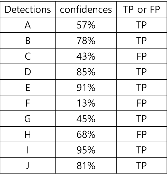 아래의 표에서는 총 15개의 이미지에서 10개의 object가 검출이 되었다고 가정한 표이다.